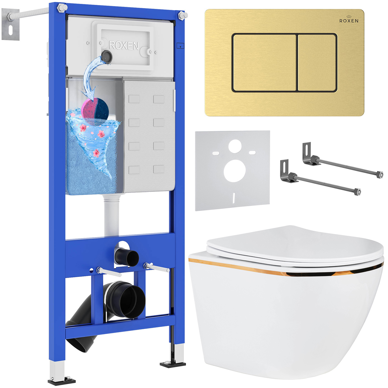 Комплект 6 в 1 унитаз Roxen Antares Gold с инсталляцией StounFix Dual Fresh 968460 (кнопка: брашированное золото)