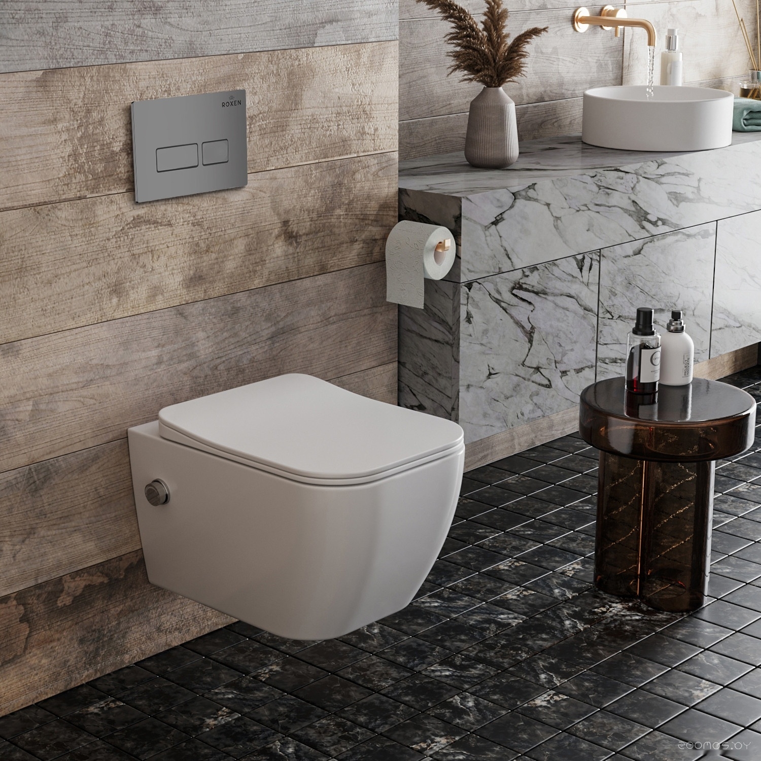 Комплект 6 в 1 унитаз Roxen Cube Bidet One Rimless с инсталляцией StounFix Slim 608961 (кнопка: матовая)