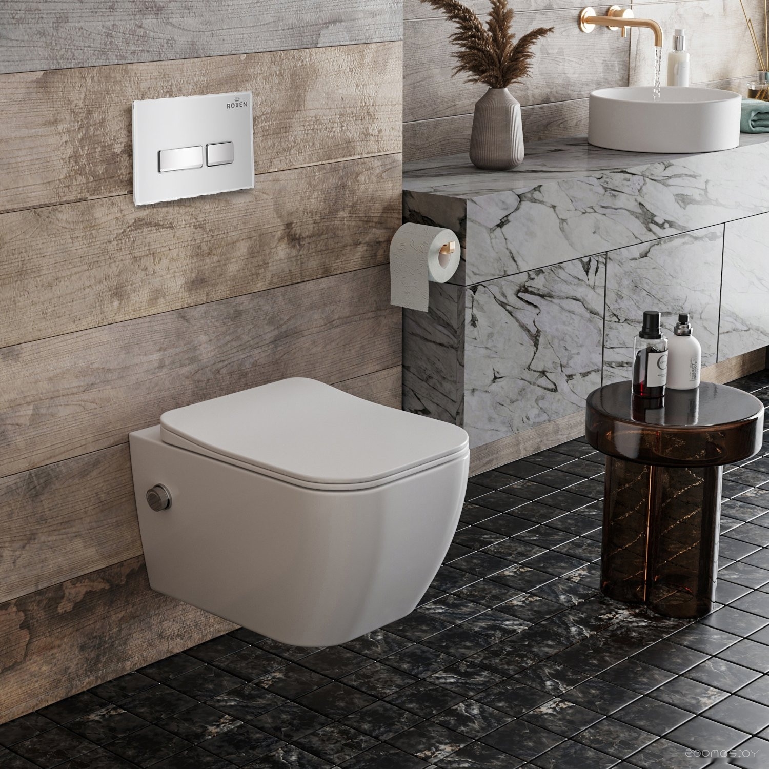 Комплект 6 в 1 унитаз Roxen Cube Bidet One Rimless с инсталляцией StounFix Slim 640526 (белое стекло)