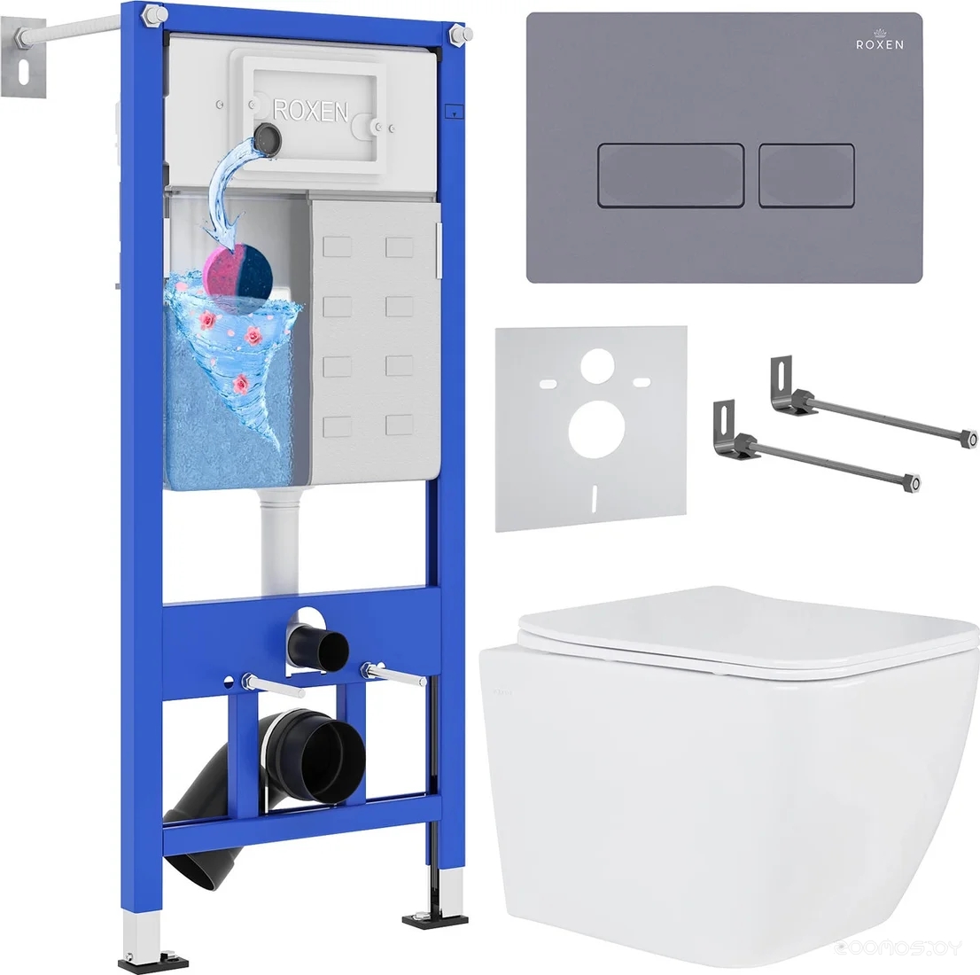 Комплект 6 в 1 унитаз Roxen Cube с инсталляцией StounFix Dual Fresh 966775 (кнопка: серый гранит)