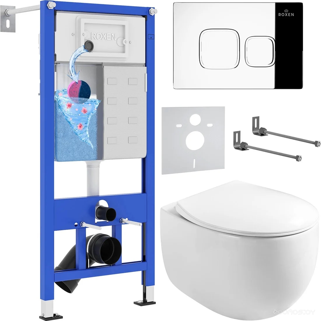 Комплект 6 в 1 унитаз Roxen Egg с инсталляцией StounFix Dual Fresh 964100 (кнопка: хром глянец)