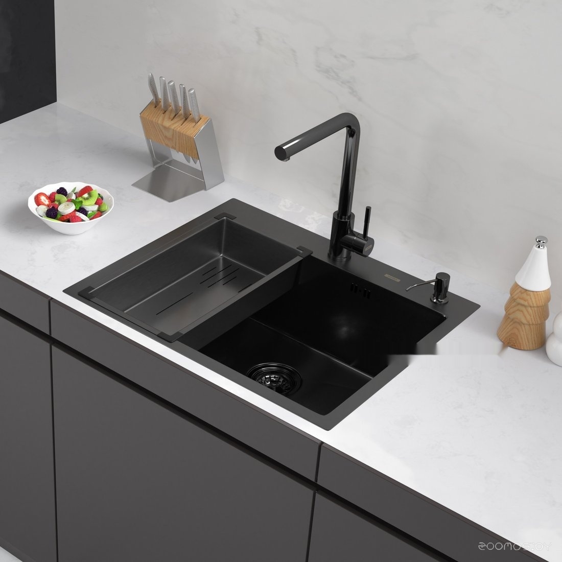 Кухонная мойка, коландер, дозатор для жидкого мыла, сливная арматура