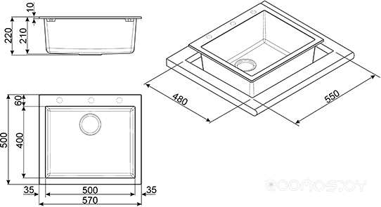 Ширина монтажного отверстия под мойку: 55 см