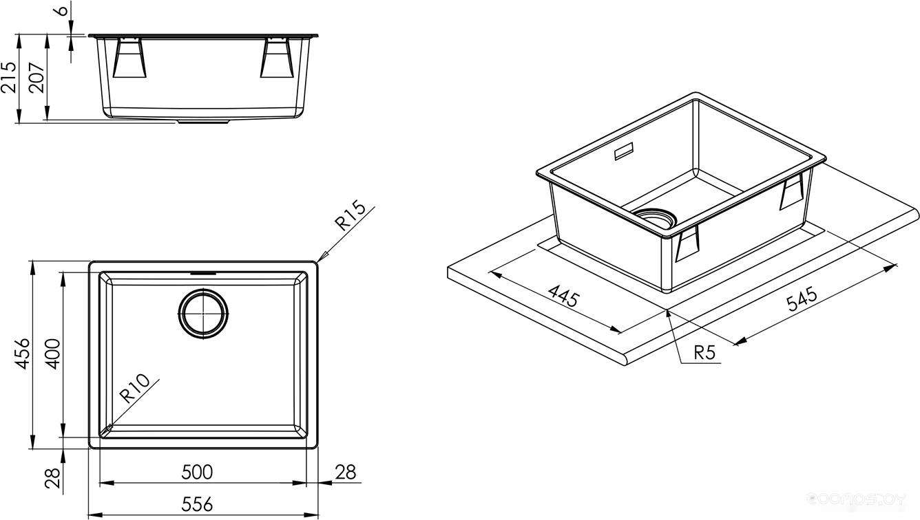 Корзинчатый вентиль, Компактный сифон с возможностью подключения посудомоечной машины, Фиксирующие зажимы