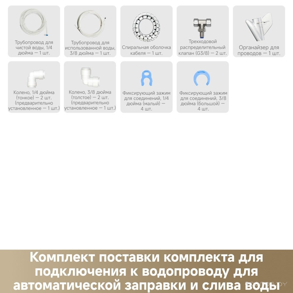 Комплектация: Робот-пылесос 1 шт. Базовая станция 1 шт. Основная щетка (предварительно установлена) 1 шт. Защита щетки (предварительно установлена) 1 шт. Боковая щетка (предварительно установлена) 1 шт. Контейнер для мусора (предварительно установлен; в комплекте с фильтром контейнера) 1 шт. Держатель салфеток для швабры 2 шт. Салфетки для швабры (предварительно установлены) 2 шт. Мешок для мусора (предварительно установлен 1 мешок) 2 шт. Инструмент для очистки 1 шт. Чистящее средство (200 мл) 1 шт. Кабель питания 1 шт. Пластина для увеличения рампы базовой станции 1 шт. Краткое руководство по эксплуатации 1 шт. Руководство пользователя 1 шт. Отсек для автоматической заправки чистящим средством (предварительно установлен) 1 шт. Фильтр поддона для мытья швабры (предварительно установлен) 1 шт. Комплект для подключения к водопроводу: Трубопровод для чистой воды, 1/4 дюйма - 1 шт. Трубопровод для использованной воды, 3/8 дюйма - 1 шт. Спиральная оболочка кабеля - 1 шт. Трехходовой распределительный клапан (G3/8) - 2 шт. Колено, 1/4 дюйма (тонкое) (предварительно установлено 1 колено) - 2 шт. Колено, 3/8 дюйма (толстое) (предварительно установлено 1 колено) - 2 шт. Фиксирующий зажим для соединений, 1/4 дюйма (малый) - 4 шт. Фиксирующий зажим для соединений, 3/8 дюйма (большой) - 4 шт. Органайзер для проводов - 1 шт. Адаптер - 2 шт.