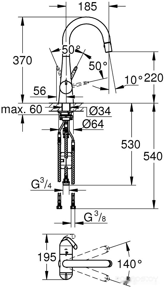 Длина излива: 185 мм