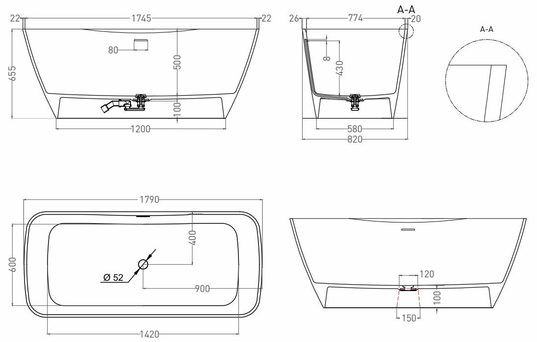 Максимальный простор и функциональность: Ванна длиной 180 см обеспечивает невероятный комфорт даже для высоких людей. Широкий плоский борт — это не только дизайн, но и полезная площадь для размещения аксессуаров, свечей или растений.