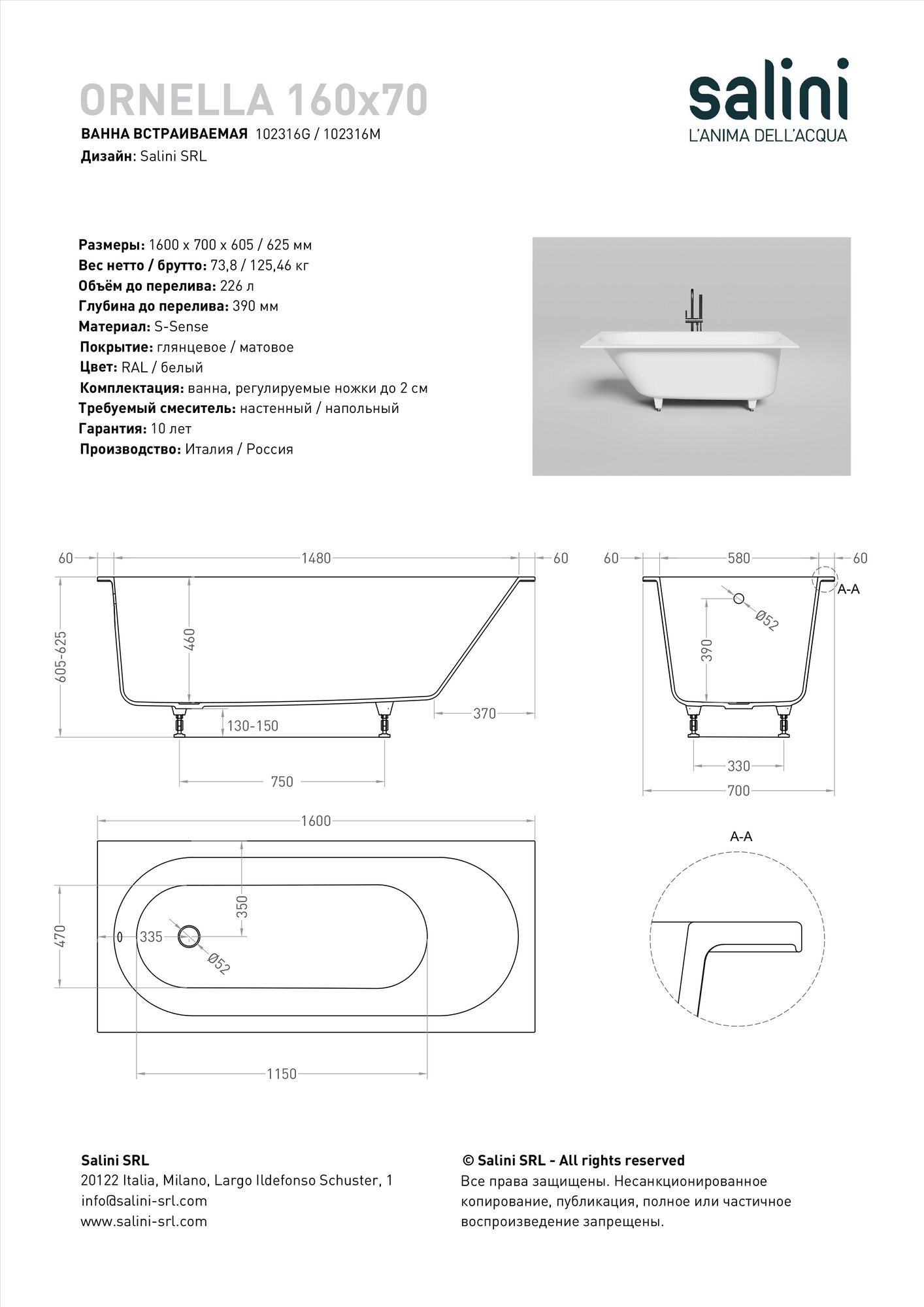 Ванна Salini Ornella — это идеальное решение для тех, кто предпочитает классические, лаконичные формы и ценит высокое итальянское качество. Её строгий прямоугольный дизайн и универсальные габариты (160x70 см) позволяют легко вписать модель в любой современный интерьер ванной комнаты, особенно при использовании популярного пристенного или островного способа монтажа.