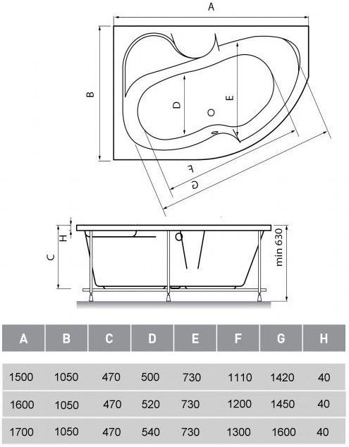 170×105 см — максимальный комфорт при сохранении асимметричной экономии (объём 280 л).