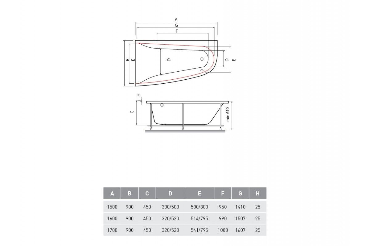 В отличие от прямоугольных ванн, где пространство распределено равномерно, асимметричная Boomerang расширена в зоне ног. Это даёт: