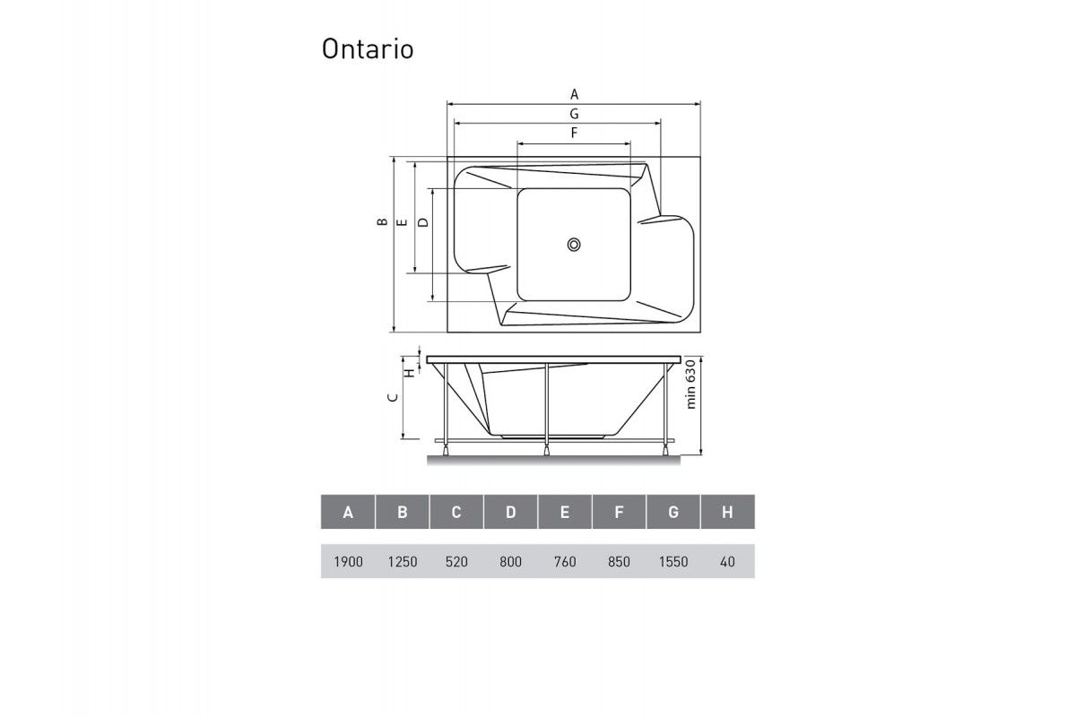 Ontario демонстрирует предельные возможности акрилового формования. При длине 190 см и ширине 125 см ванна сохраняет жёсткость и геометрию благодаря технологии EVERHARD и усиленному армированию.