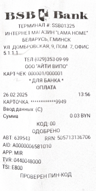 В мобильном банкинге или банковском приложении выберите «Система Расчет (ЕРИП)» -> «Сервис E-POS». Перейдите в «E-POS-оплата товаров и услуг». Введите полученный от нашего менеджера номер заказа и нажмите “Продолжить”. Проверьте корректность информации и совершите платеж. Обязательно уточните получение оплаты у менеджера перед доставкой.