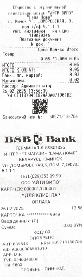 Образец чека при оплате картой и наличными